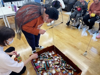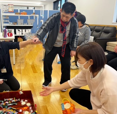 制限時間の中で、箱いっぱいに入ったお菓子をたくさん釣り上げて、大盛り上がりでした!釣ったお菓子は、「トリックオアトリート」の合言葉で職員から受け取るなどハロウィンならではの楽しい演出もありました。