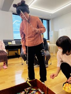 ハロウィンパーティーでは、まず「ハロウィンとは何?」について学びました。その後、2種類のゲームを楽しみました!一番の盛り上がりを見せたのは、お菓子釣りゲーム!